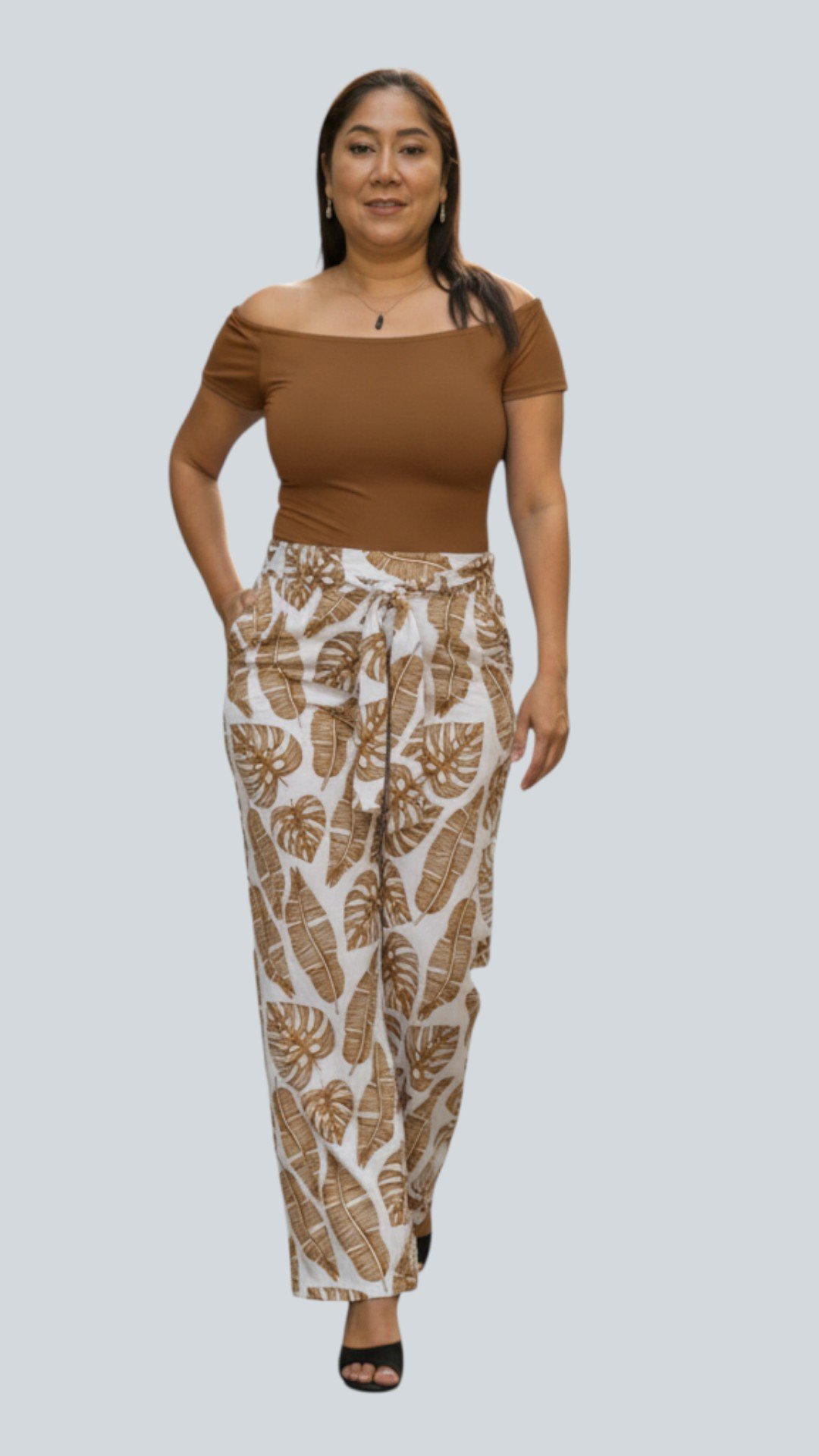 Descubre el encanto del pantalón de lino estampado con hojas, diseñado para quienes buscan un equilibrio perfecto entre elegancia casual y comodidad. Este pantalón incorpora un estampado natural que agrega un toque sofisticado y fresco a cualquier look.